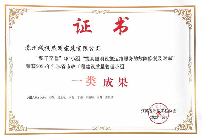 蘇州照明設(shè)施運(yùn)維課題獲江蘇省市政工程建設(shè)質(zhì)量管理小組“一類成果”